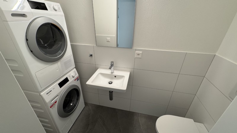 Im Eingangsbereich befindet sich eine praktische Einbaugarderobe sowie ein Gäste-WC, welches mit WM/TU ausgestattet wurde.