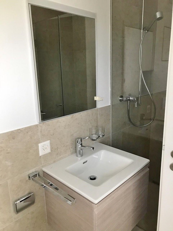 Die 45m² Wohnung besteht aus einem grossen Raum, in dem sich eine Küchenzeile befindet. Diese besteht aus einem Kühl-und Gefrierschrank sowie einem Geschirrspüler. Das angrenzende Bad verfügt über ein Brünneli, ein WC und eine grosse Dusche. Die Lüftung erfolgt über das Fenster. Der Eingangsbereich, Küche / Wohnen, und die Nasszelle sind mit hellen, modernen Platten ausgestattet.