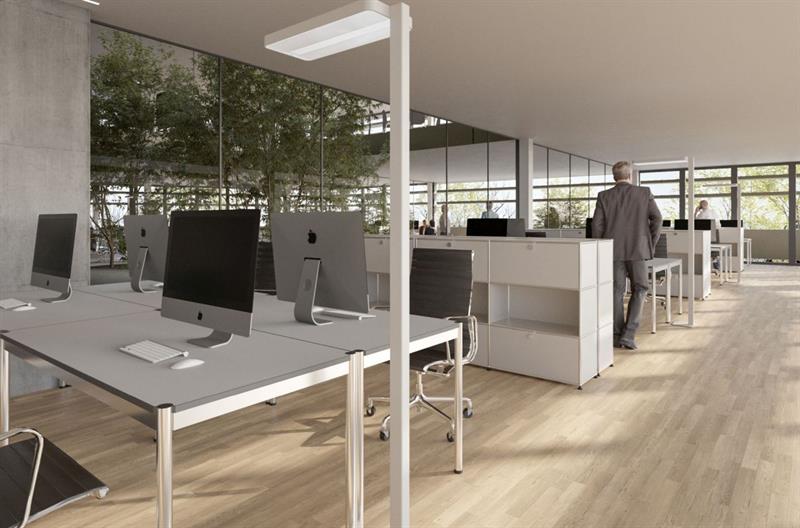 Die Grundrisse bestehen aus einem tragenden Stützenraster und einem Kern mit der vertikalen Haupterschliessung (Treppe, Lift, Steigzone und WC Anlage). Trennwände können flexibel erstellt werden. Ein begehbarer Zwischenraum dient als konstruktiver Witterungsschutz. Fixe horizontale Metalllamellen schützen vor Sonneneinstrahlung ohne zusätzliche Sonnenschutzmassnahmen ergreifen zu müssen. Die Räume bleiben lichtdurchflutet mit offenem Blick nach draussen.
