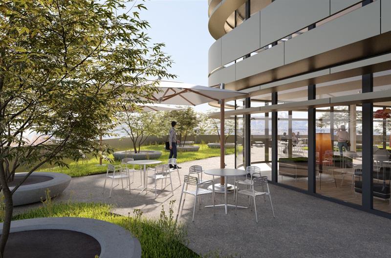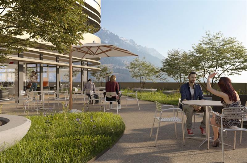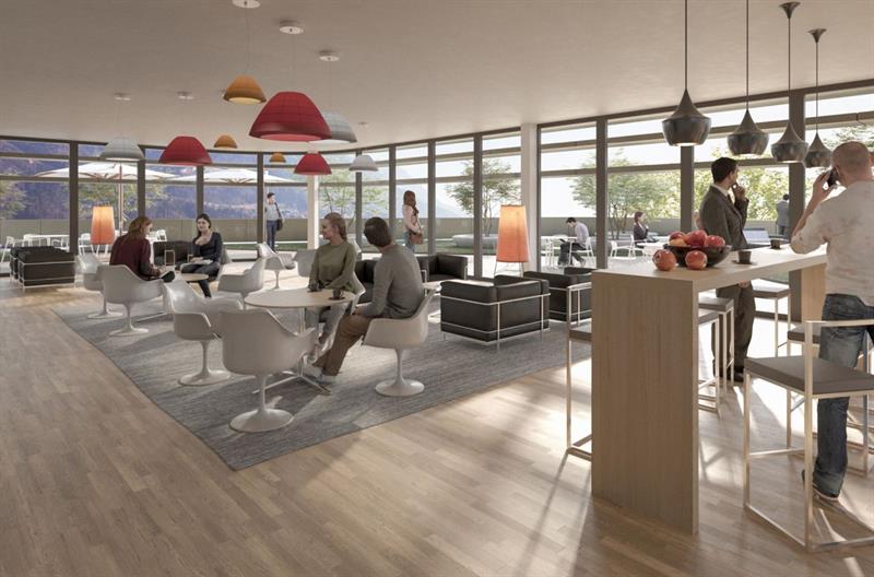 Im 3. Obergeschoss entstehen ein Fitnessraum, ein Ruheraum, eine Cafeteria und eine grosszügige Dachterrasse für die optimale Ausnutzung von Arbeitspausen. Im Erdgeschoss sind neben der Lounge, dem Auditorium und dem Placa auch funktionale Räume wie Umkleiden für die Mitarbeiter konzipiert. In den Untergeschossen entstehen rund 101 komfortable Mitarbeiter- und Kundenparkplätze. Kurzbesucherparkplätze vor dem Businessgebäude ergänzen die Situation.