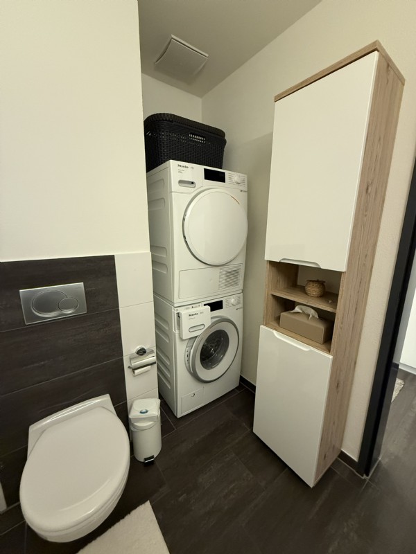 - Badezimmer mit Toilette, Badewanne, Waschmaschine und Trockner