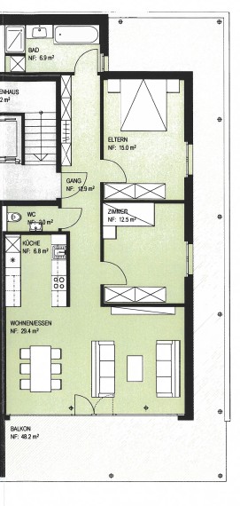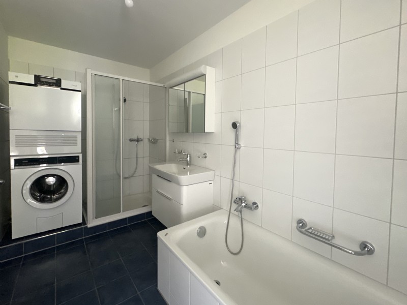 Im Eingangsbereich finden Sie Einbauschränke mit genügend Stauraum. Ebenfalls im Eingansbereich befindet sich das separate WC. Das Badezimmer ist mit einer Badewanne sowie einer Dusche ausgestattet. Die Waschmaschine und der Trockner sind bestandteil der Wohnung. Die zwei Schlafzimmer sind grosszügig geschnitten. Der Wohn- und Essbereich ist offen gestaltet und grenzt an die grosszügige Küche an. Durch die vielen Fenster und den grossen Balkon ist die Wohnung ein idealer Erholungsort.