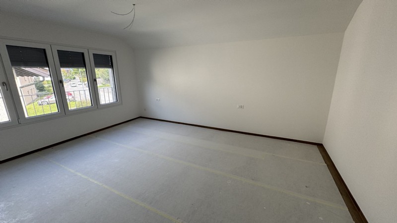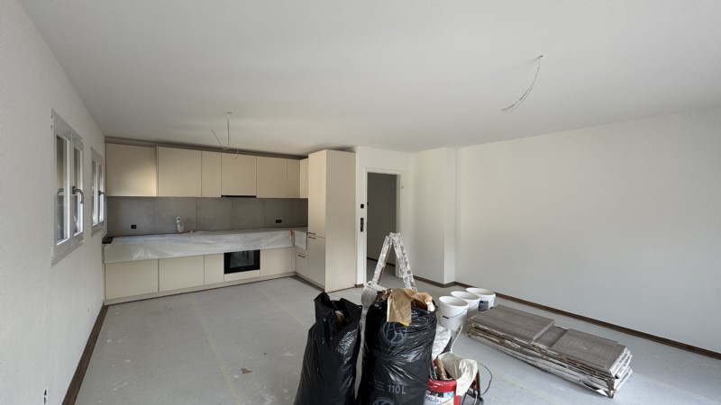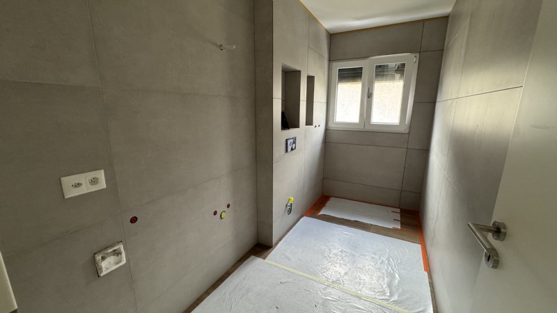 Der Boden wird mit Platten in Holzoptik verlegt. Die Küche ist modern ausgestattet. Waschmaschine und Tumbler sind im Bad untergebracht.