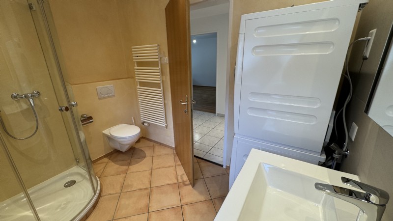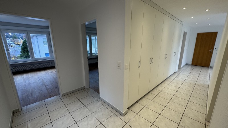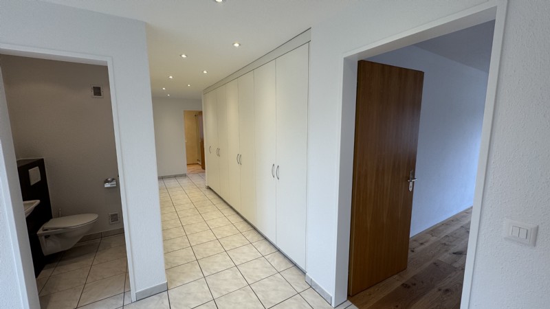 Der Gang in den hinteren Teil der Wohnung wurde mit praktischen Einbauschränken vershen. Hier befinden sich drei grosszügige Schlafzimmer sowie das Bad mit Dusche und integrierten Waschmaschine und Tumbler.