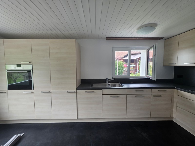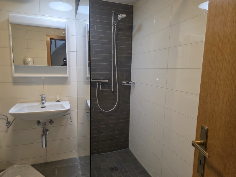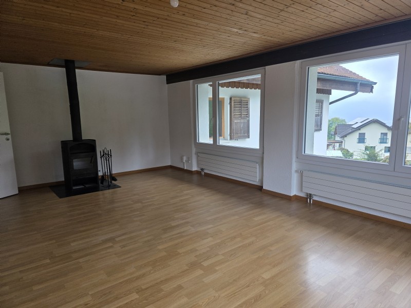 1. OG: grosszügiger Flur, 29 m² grosses Wohnzimmer mit Ofen, sep. grosse Küche mit Essbereich, Gäste-WC, 27 m² grosses Zimmer mit Zugang zur gedeckten Terrasse mit Morgensonne, Badezimmer mit Badewanne sowie ein Badezimmer mit Dusche.