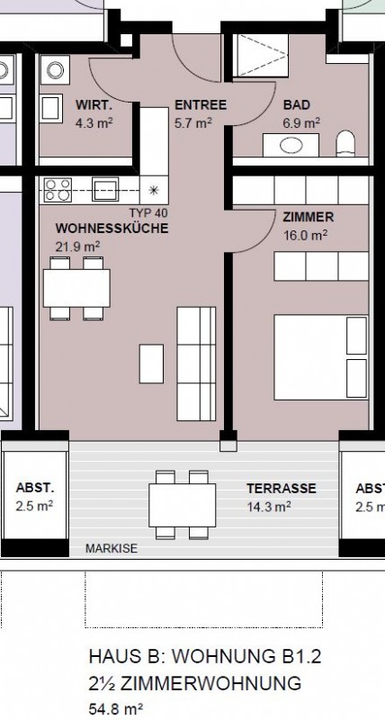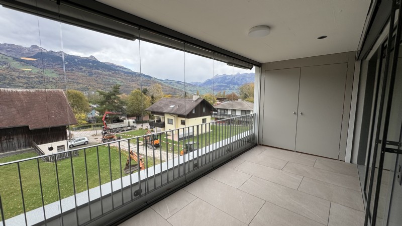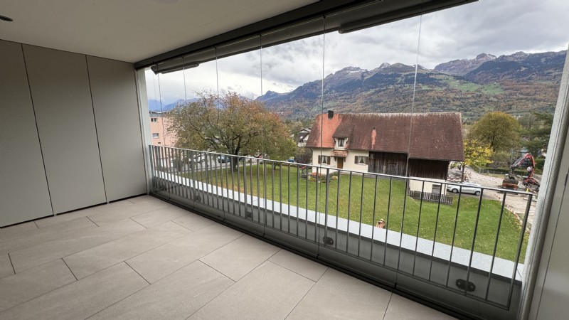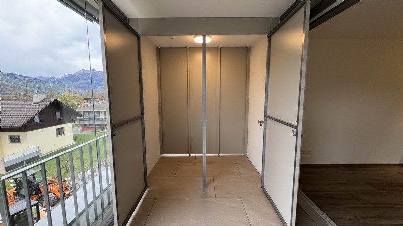 Sowohl das Schlafzimmer als auch der Wohnbereich bieten einen angenehmen Blick auf die überdachte Loggia. Dank der integrierten Verglasung kann dieser Raum fast das ganze Jahr über genutzt werden. Der Wintergarten lässt sich mit einfachen Handgriffen in einen sonnigen Balkon verwandeln, so dass der grossflächige Balkon zu einem harmonischen, gemütlichen Rückzugsort wird. Ein praktischer Abstellraum bietet hier zusätzlichen Platz für Alltägliches.