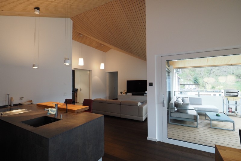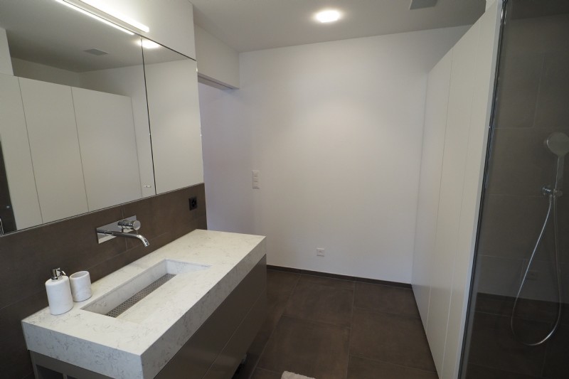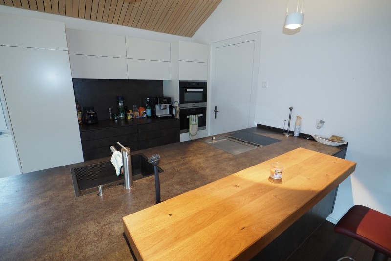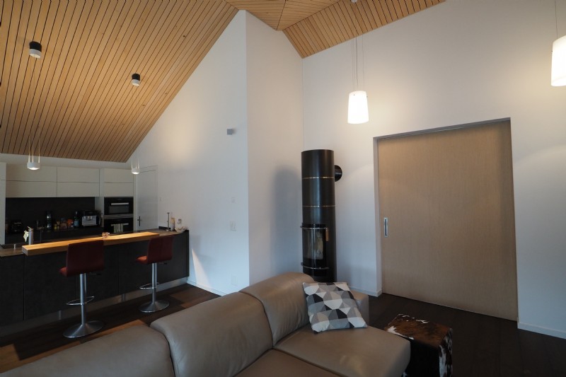 Die Wohnung wartet mit einer überdurchnittlichen Raumhöhe von teils 4.5 bis 5 Metern auf. Eine hochwertige Ausstattung wie zB. Akustikdecke, Eichenparkett, diverse Extras in der Küchenausstattung, Messina-Speicherofen, Einbauschränke, etc. runden neben der schönen Aussicht das Profil dieser Wohnung ab. Eines der drei Schlafzimmer hat einen direkten Zugang zum Bad mit Dusche/WC und WM/TU. Ein separates WC dient für Gäste gleich im Eingangsbereich.