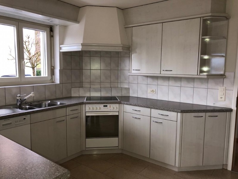 - Grosszügige Wohnküche mit viel Arbeitsfläche, reichlich Stauraum, grossem Fensterbereich und Platz für einen Esstisch