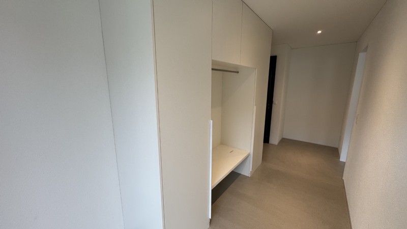 Der Eingangsbereich dieser Wohnung ist separat und verfügt über eine grosszügige Einbaugarderobe. Sie kann entweder über den eigenen Hauseingang, oder über das Treppenhaus von der Garage betreten werden.