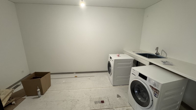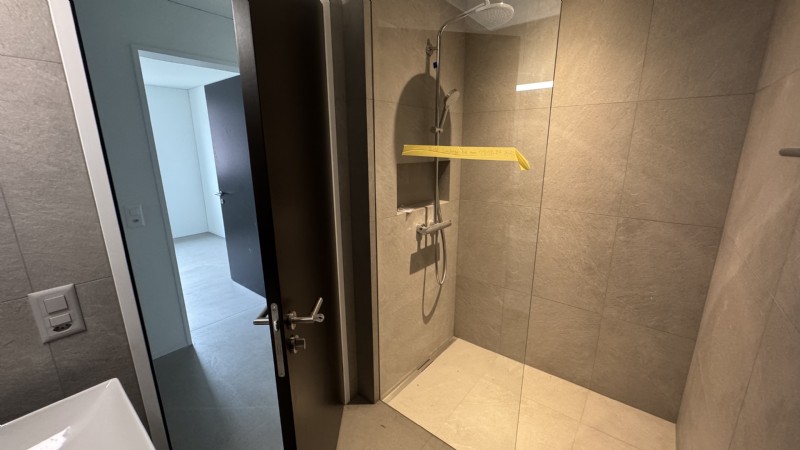 Ein grosser Hauswirtschaftsraum mit WM/TU und viel Stauraum rundet das Angebot dieser durchdachten Wohnung ab. Ein edler Steinboden in grauer Farbe leitet durch die gesamte Wohnung. Helle Platten finden sich in den Badezimmern.