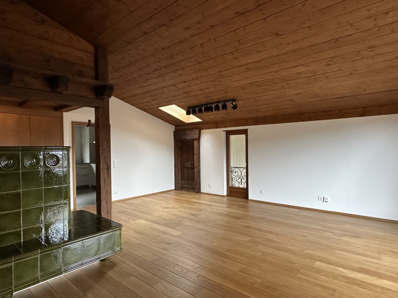 Ein traditioneller Ofen mit integrierter Ofenbank sorgt für behagliche Wärme und lädt zum Verweilen ein. Zusätzlich verfügt die Wohnung über einen begehbaren Kleiderschrank, der komfortablen Stauraum und Ordnung ermöglicht. Grosszügige Abstellflächen mit insgesamt knapp 70 m² bieten aussergewöhnlich viel Platz und eignen sich ideal für diverse Nutzungsmöglichkeiten.