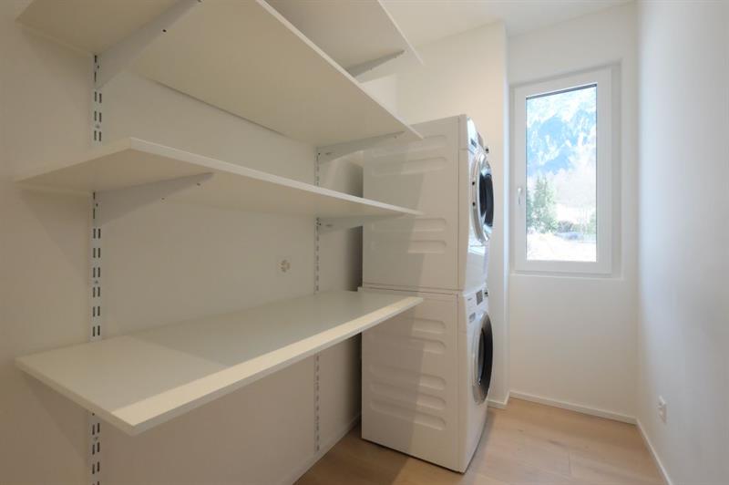 Die moderne Küche ist harmonisch in den Wohnraum integriert und mit hochwertigen Geräten ausgestattet. Drei Schlafzimmer, darunter ein grosszügiges Masterzimmer mit eigenem Bad (Badewanne/WC), sowie ein stilvoll ausgestattetes Badezimmer (DU/WC) bieten ein hohes Mass an Komfort. Ein separater Hauswirtschaftsraum innerhalb der Wohnung mit WM/TU sorgt für zusätzlichen Stauraum und Funktionalität.