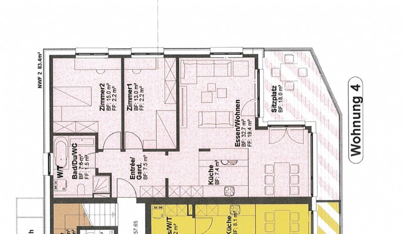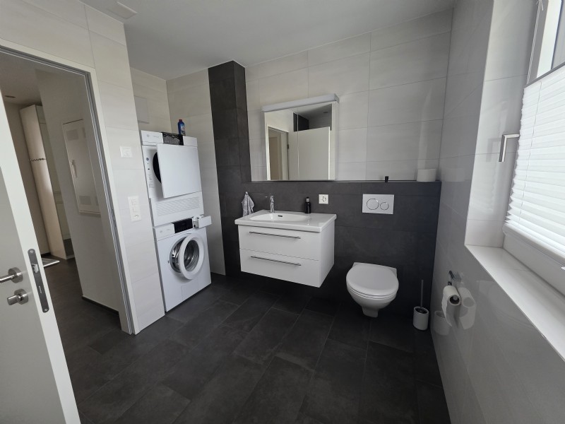 Die Wohnung verfügt über einen einladenden Eingangsbereich, eine moderne Küche mit offenem Wohn- und Essbereich, zwei komfortable Schlafzimmer sowie ein Badezimmer mit WC, grosser Dusche und eigenem WA/TU.