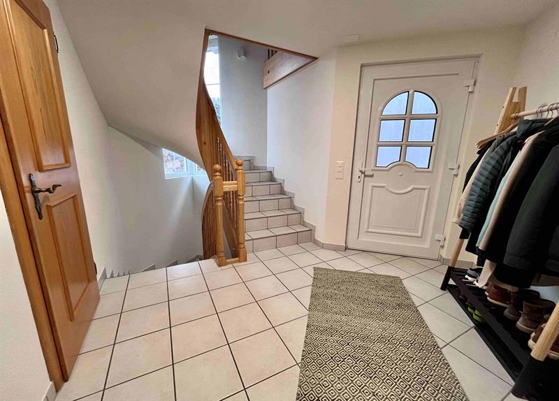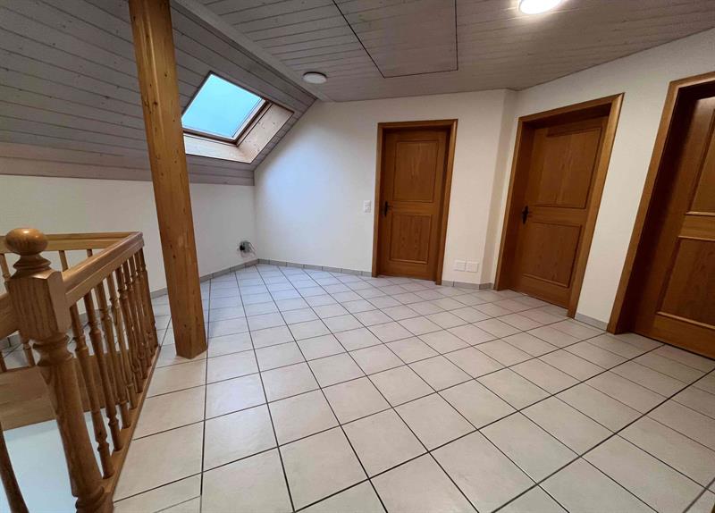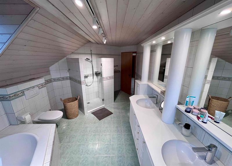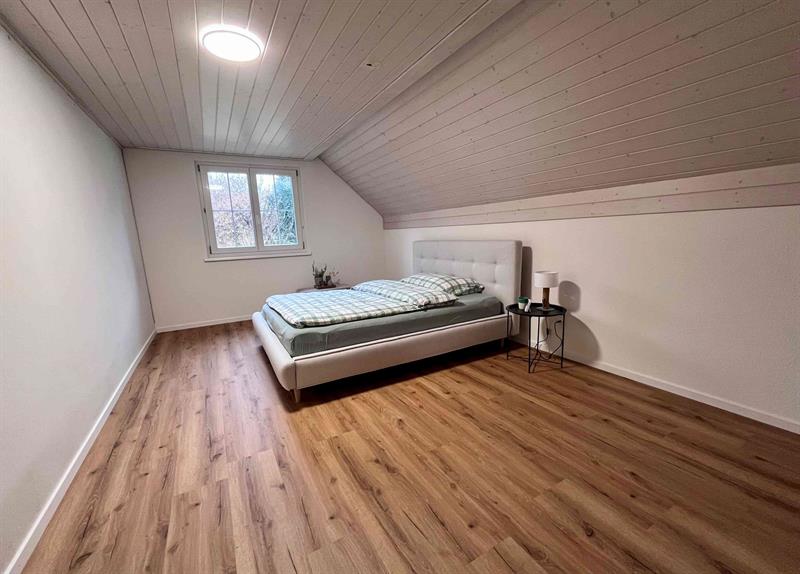 Im Obergeschoss stehen mehrere gut geschnittene Zimmer mit gemütlichen Dachschrägen zur Verfügung, die flexibel als Schlaf-, Kinder- oder Arbeitszimmer genutzt werden können. Das grosszügige Badezimmer ist mit Badewanne, separater Dusche und Doppelwaschtisch ausgestattet. Ein Gäste-WC im Erdgeschoss ergänzt das Raumangebot.