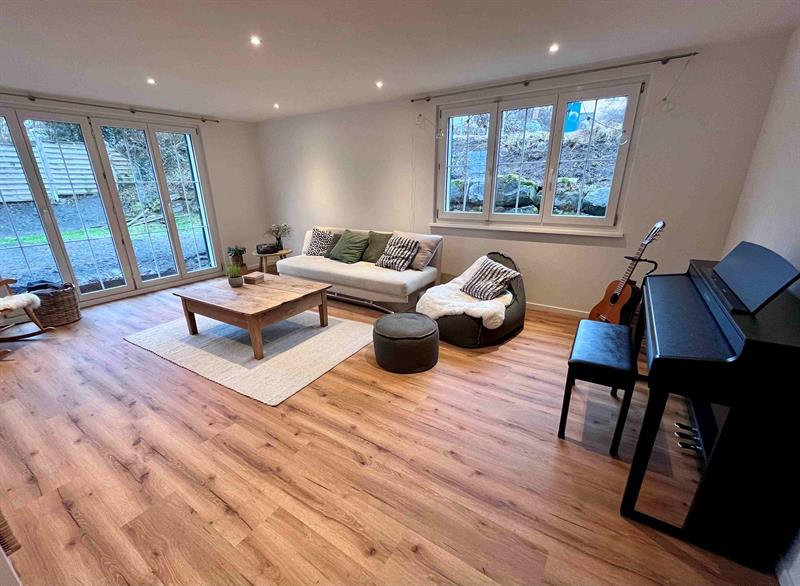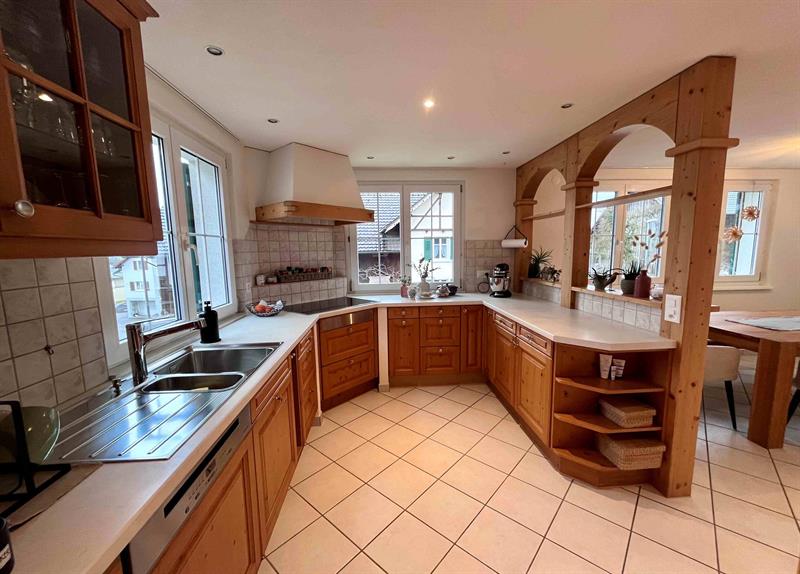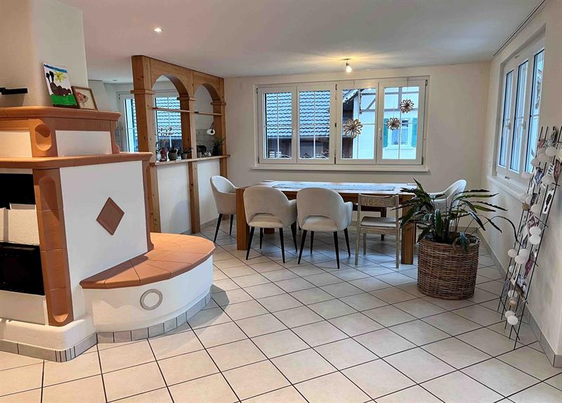 Das Einfamilienhaus überzeugt durch eine grosszügige Raumaufteilung, viel Tageslicht und eine ruhige Wohnlage. Der helle Wohn- und Essbereich mit direktem Zugang zum Aussenbereich mit Terrasse und Garten bildet das Herzstück des Hauses und wird durch einen stilvollen Kachelofen zusätzlich aufgewertet. Die separate Küche mit zeitloser Holzausstattung bietet viel Stauraum und Arbeitsfläche.