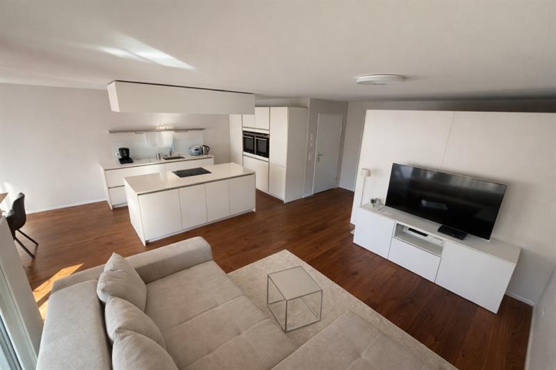 Die Wohnung überzeugt durch eine grosszügige und durchdachte Raumaufteilung. Herzstück ist der helle Wohn-/Ess-/Kochbereich mit moderner Küche und Kochinsel sowie direktem Zugang zur Terrasse. Drei gut geschnittene Schlafzimmer bieten vielseitige Nutzungsmöglichkeiten. Ergänzt wird das Raumangebot durch ein Badezimmer mit Badewanne und Duschtrennwand sowie ein separates Gäste-WC. Hochwertige Parkettböden in den Wohn- und Schlafräumen sowie Plattenbeläge in den Nasszellen unterstreichen den modernen Ausbaustandard.