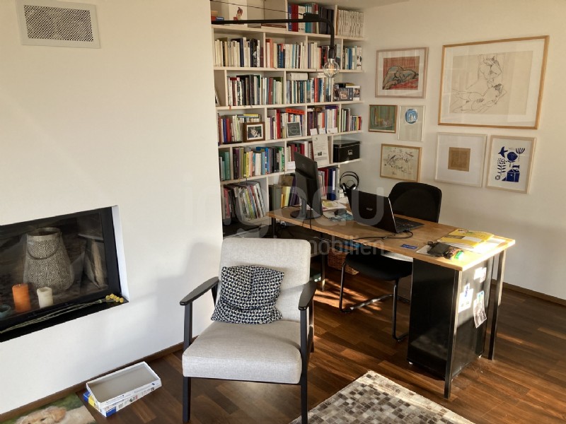 Der helle, offen gestaltete Wohn- und Essbereich bildet das Herzstück der Wohnung. Grosszügige Fensterfronten lassen viel natürliches Licht herein und schaffen eine freundliche, einladende Atmosphäre. Ein stilvolles Cheminée sorgt zusätzlich für wohlige Wärme und verleiht dem Raum eine besondere Behaglichkeit. Von hier aus gelangen Sie direkt auf die geschützte Loggia, die den Wohnraum harmonisch nach draussen erweitert – ein perfekter Ort, um die Aussicht zu geniessen und entspannte Stunden im Freien zu verbringen.