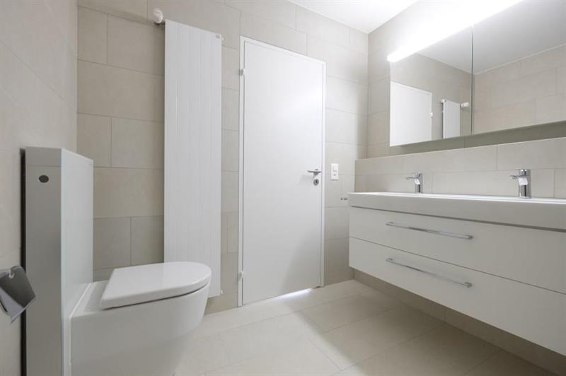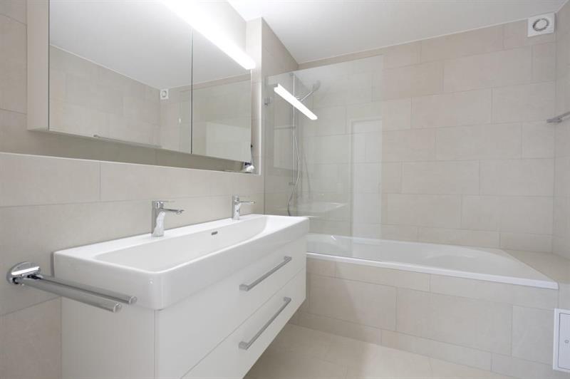 Nasszelle ist mit einer Badewanne, einem Doppellavabo, einem WC