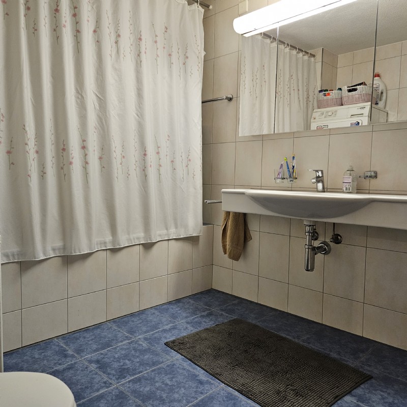 -Badezimmer mit Badewanne und Doppellavabo sowie Unterbau (zudem Anschluss für WA/TU vorhanden)