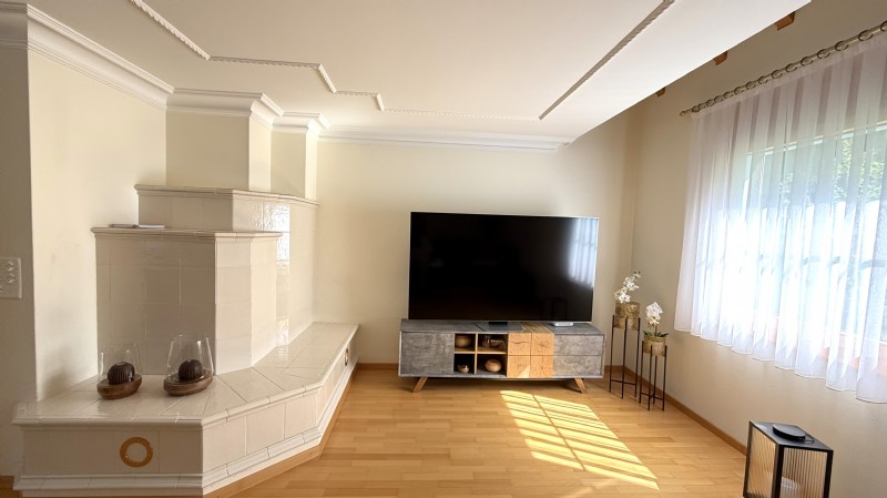 - Grosszügiges Wohnzimmer mit gemütlichem Kachelofen und direktem Zugang zur Terrasse