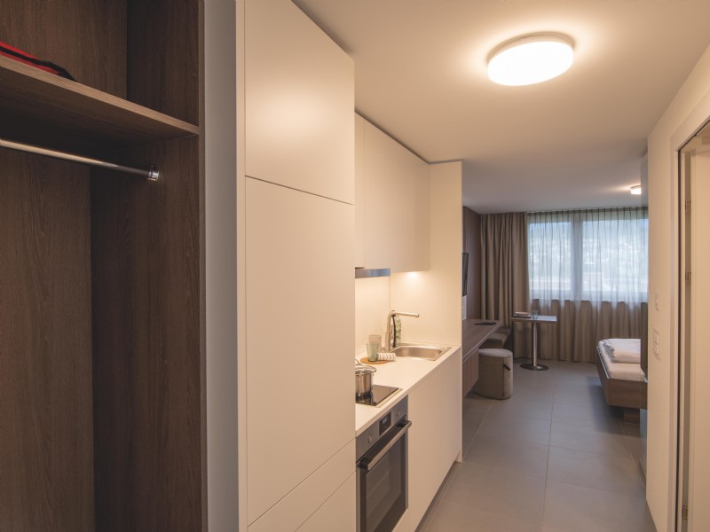 Auf einer Wohnfläche von ca. 25 m2 verfügt das möblierte Appartement über einen Eingangsbereich mit Garderobe und Küchenzeile, ein grosses Badezimmer mit Dusche sowie einen Wohn-/Schlafbereich. Zur Ausstattung des Appartements zählen zudem ein Bett, Einbauschrank, Spiegel, Board mit Sessel, Sitzbank Tages- und Nachtvorhänge sowie ein TV-Gerät.